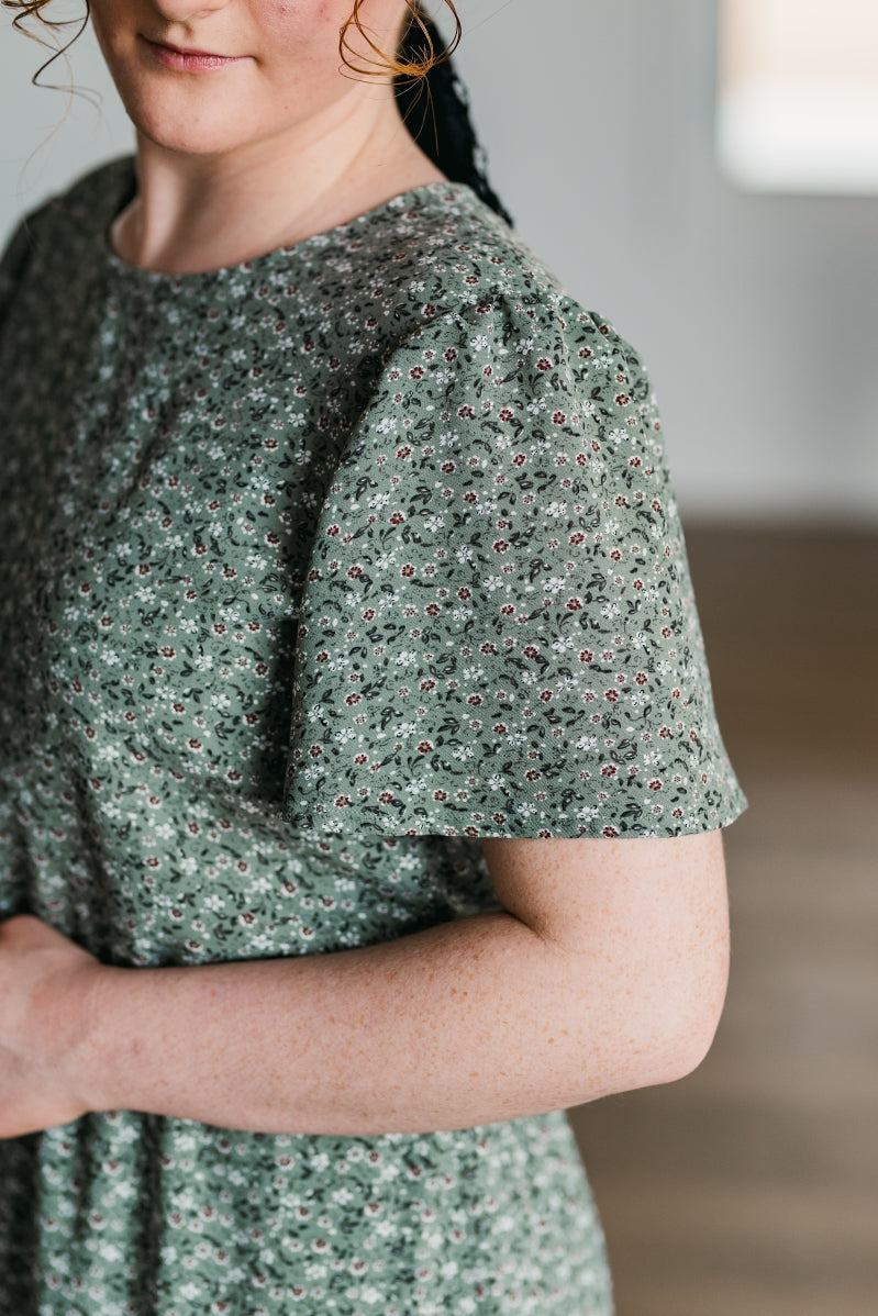 The Jewel Dress – Timeless and modest, this dress features a soft sage-green base adorned with a delicate floral print. The relaxed flutter sleeves offer graceful movement, while the fitted elastic waistline provides a comfortable, flattering silhouette. Designed with a flowing maxi length, it’s perfect for all-day wear, from casual gatherings to special occasions. Made from lightweight, breathable fabric, the Jewel Dress combines elegance and comfort beautifully.